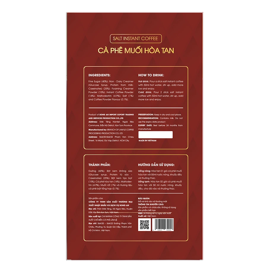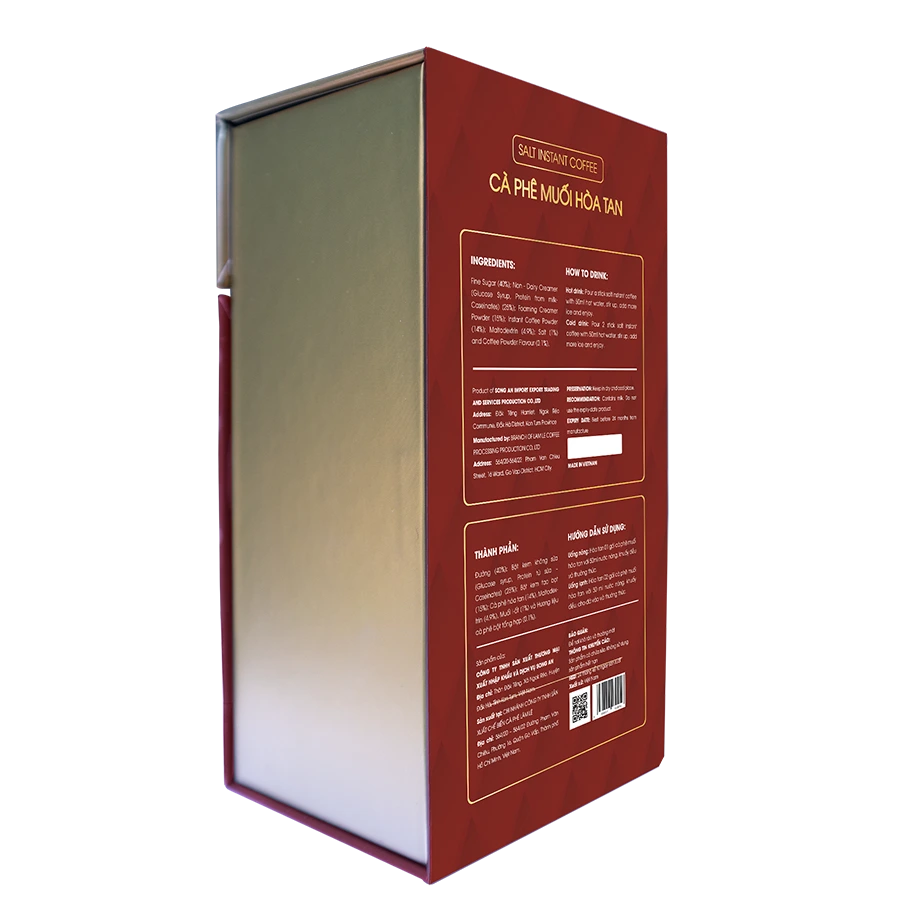 SALT INSTANT COFFEE is a wonderful combination of the rich coffee of the Central Highlands mountains and the salty taste of Phu Quoc sea salt. You will experience the fragrant and rich taste of milk foam – a smooth layer of milk foam created by advanced technology.